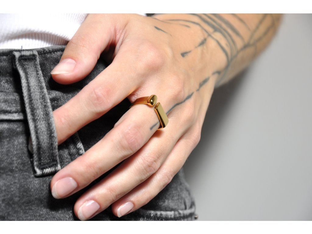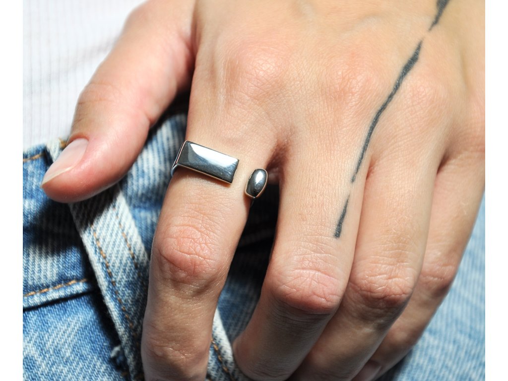 Ellin je otvorený prsteň s výraznými zakončeniami – hladký ovál oproti hranatému bloku vytvára odvážny, ale vyvážený kontrast.